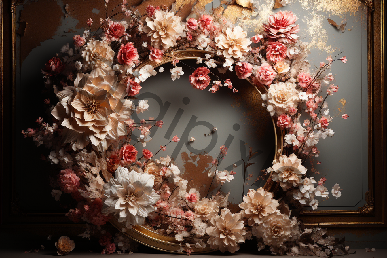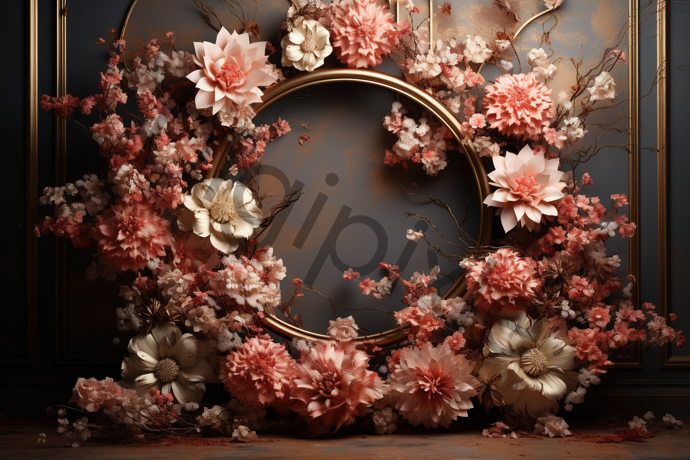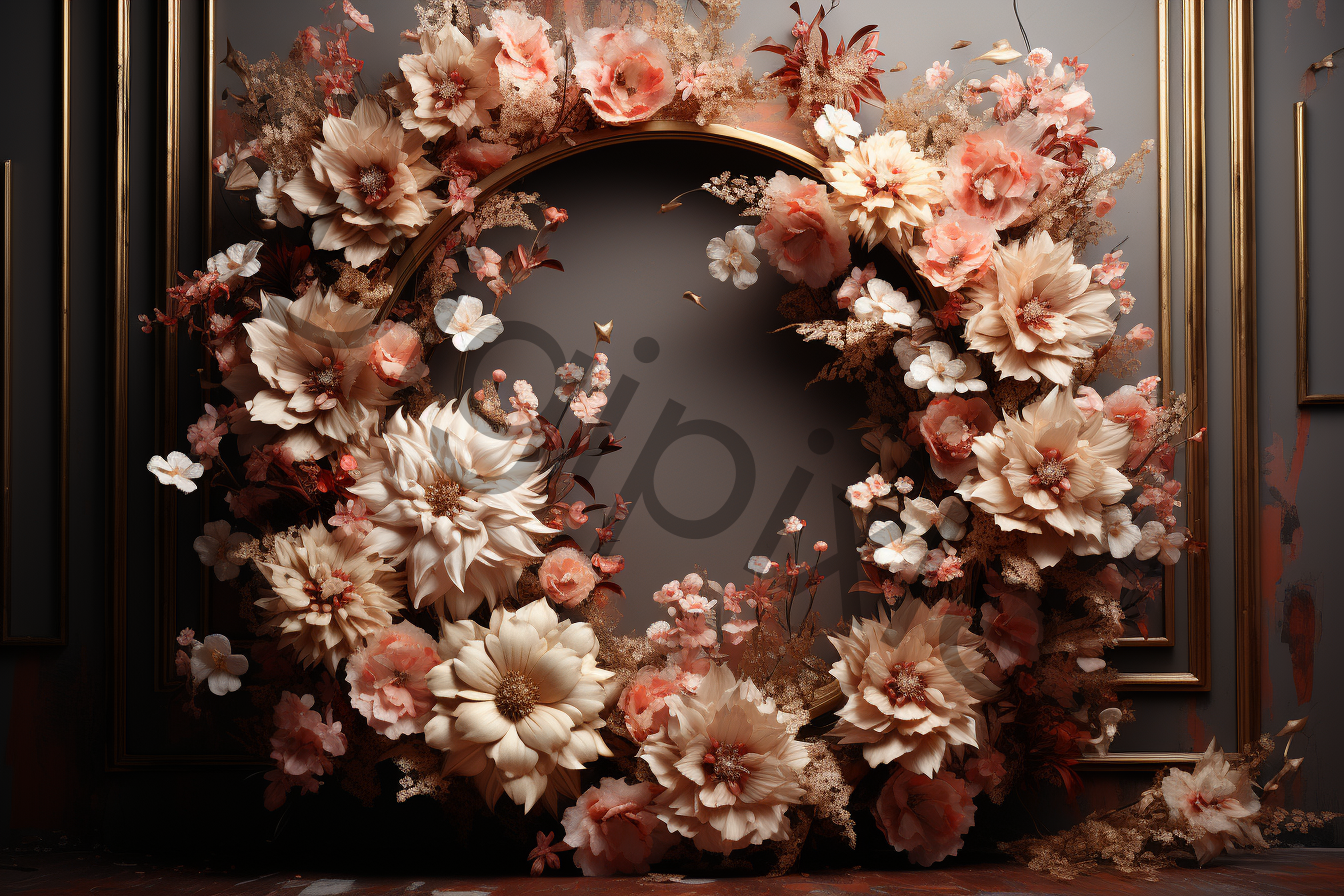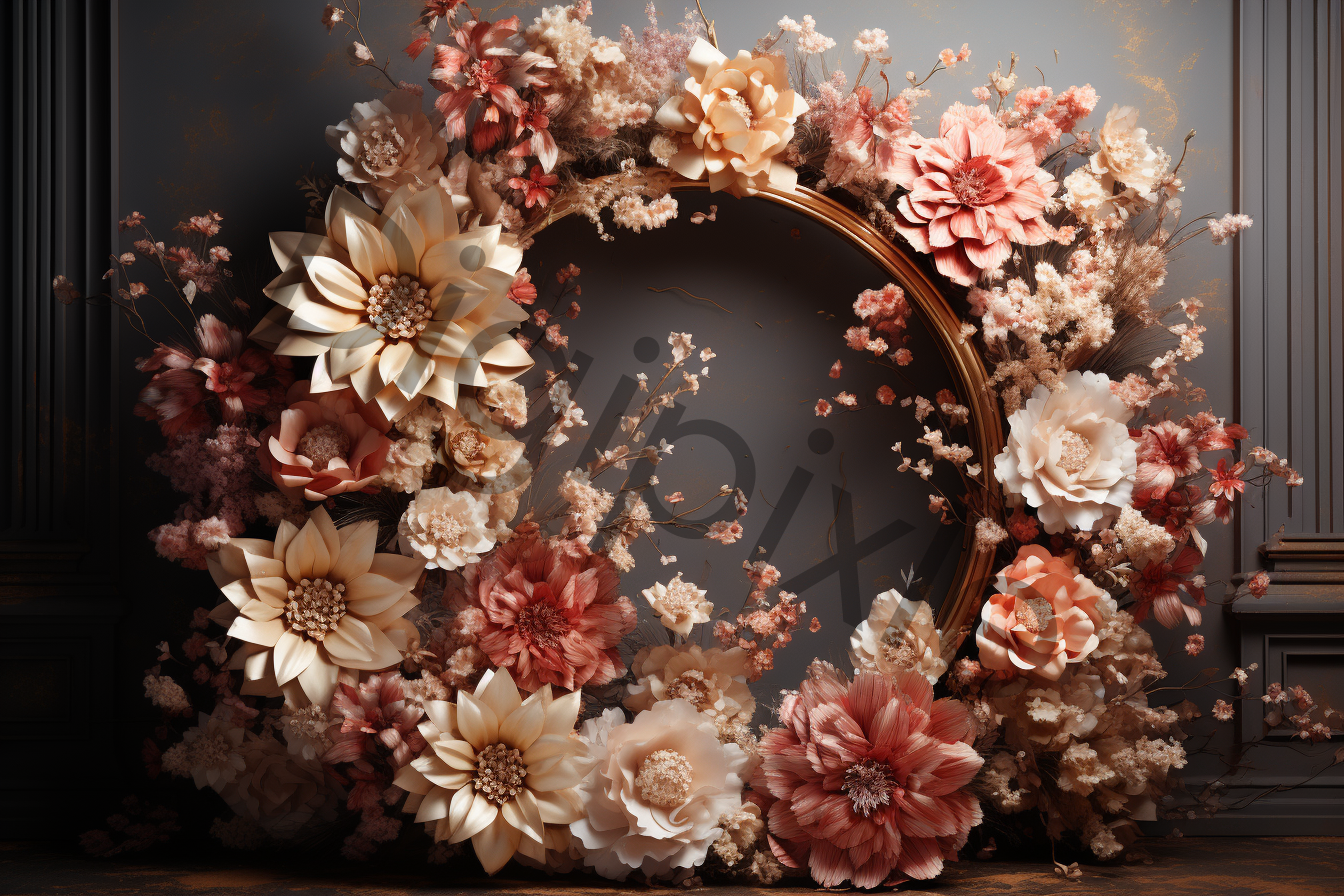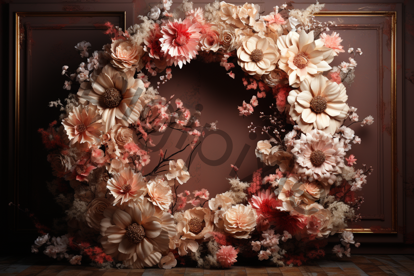 Beautiful floral backdrops, featuring an enchanting blend of roses, tulips, peonies, and carnations delicately arranged in floral hoops.